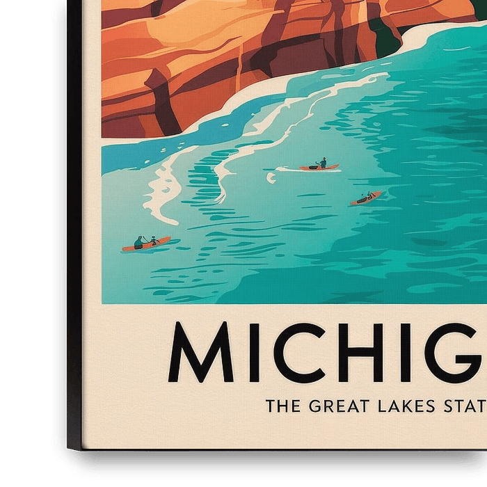 Ein farbenfrohes Spiel von warmen Erdtönen, das die majestätischen Klippen von Michigan in Szene setzt, harmoniert perfekt mit dem glitzernden Wasser des Großen Sees. Diese Darstellung der Natur lädt zu Träumen von Abenteuern und Erholung ein und eignet sich hervorragend für das Wohnzimmer, um eine entspannte Atmosphäre zu schaffen.