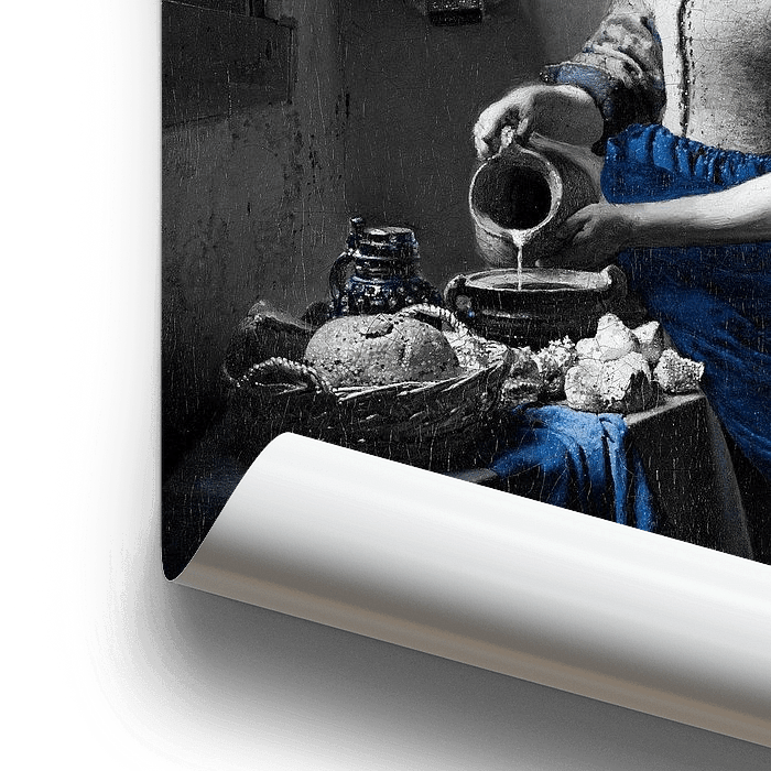 Das Milchmädchen mit einem Hauch von Blau. Die Milchmagd ist ein Gemälde des niederländischen Meisters Johannes Vermeer. Die Kombination mit den Delfter Blau-Elementen macht diese Statue einzigartig.