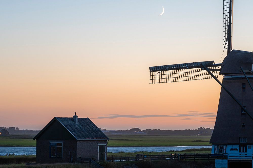 Mill Het Noorden auf Texel bei Sonnenuntergang und mit dem Neumond zwischen den Segeln.