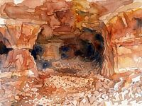 Tauchen Sie ein in die verborgene Welt unter der Erdoberfläche. Dieses hochexpressive Aquarell interpretiert die historischen Mineneingänge von Midelt in Marokko als ein faszinierendes Zusammenspiel aus Licht, Schatten und geologischen Strukturen.