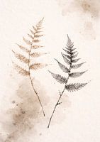 Minimalistisches Aquarellkunstwerk mit zwei zarten Farnblättern in sanften, neutralen Farbtönen auf einem strukturierten Papierhintergrund. Inspiriert von japanischer und skandinavischer Ästhetik bringt dieser beruhigende botanische Druck natürliche Ausgewogenheit, ruhige Eleganz und organische Wärme in moderne, Japandi- und…