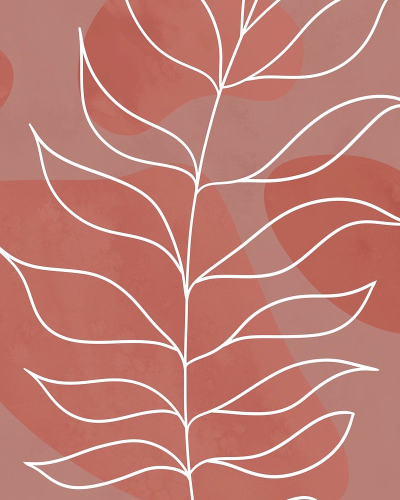 Minimalistische Illustration eines Zweigs mit Blättern und vier organischen Formen, in Weiß und Variationen von Terrakotta-Rot.