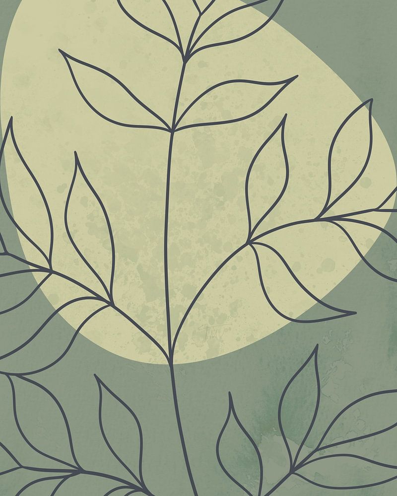 Minimalistische Illustration eines Zweigs mit Blättern und einer natürlichen Form im Hintergrund. Die Farben - Variationen von gedecktem Grün - sind von den Farben eines frühen Frühlingsmorgens inspiriert.