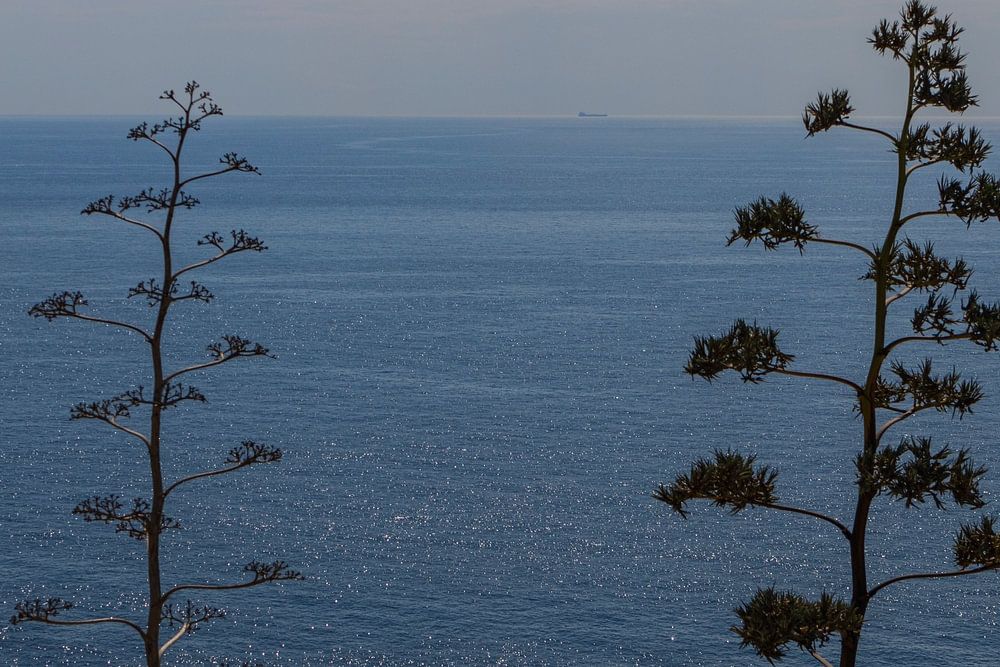 Blick auf das Mittelmeer in Malta, mit den Zweigen einiger Bäume im Vordergrund. Minimalistische Landschaft.