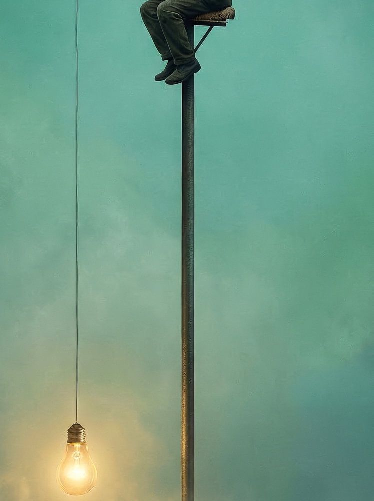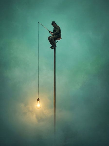 Ein Mann sitzt hoch oben auf einem schmalen Pfahl, allein in einem weiten und ruhigen Raum. Er hält seine Angelrute fest und blickt konzentriert nach unten. Am Ende der Schnur hängt kein Fisch, sondern eine warme, sanft leuchtende Lampe, die dem Bild eine besondere und unerwartete Wendung verleiht.