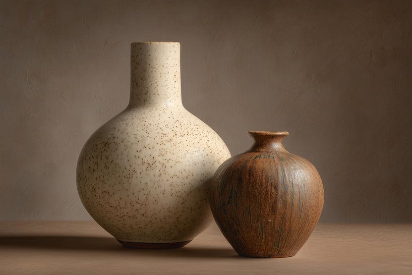 Bei diesem minimalistischen Stillleben im japanischen Stil dreht sich alles um Form, Material und Ruhe. Zwei Vasen stehen nebeneinander, einfach und doch kraftvoll in ihrer Präsenz. Die helle Keramikvase hat einen weichen, matten Look mit subtilen Sprenkeln, die ihre Oberfläche beleben. Die kleinere, dunklere Vase daneben wirkt warm und…