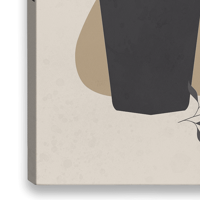 Minimalistisches Stillleben mit einer dunkelgrauen Flasche, zwei Zweigen von zwei verschiedenen Pflanzen und einer hellbraunen organischen Form auf beigem Hintergrund.