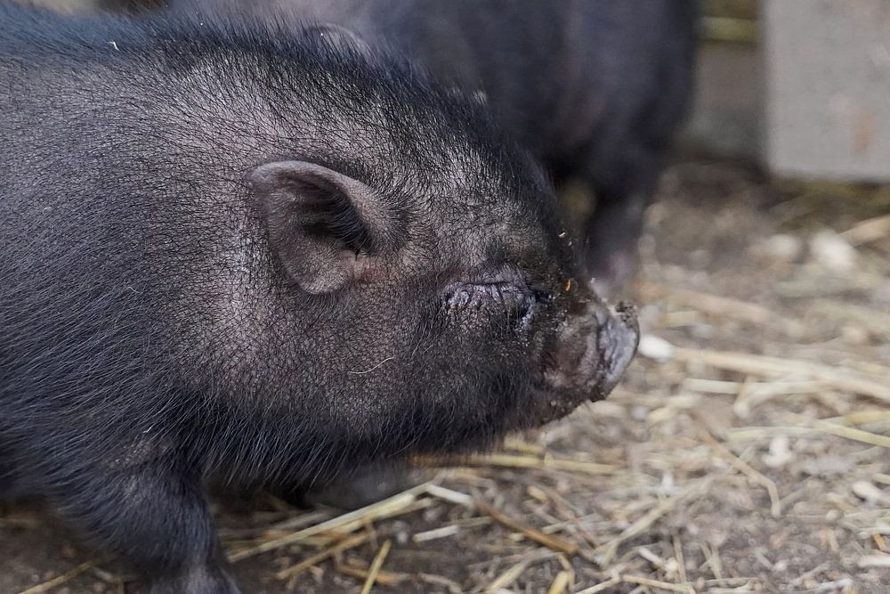 Mini pigs babies at the first walk outside in Germany