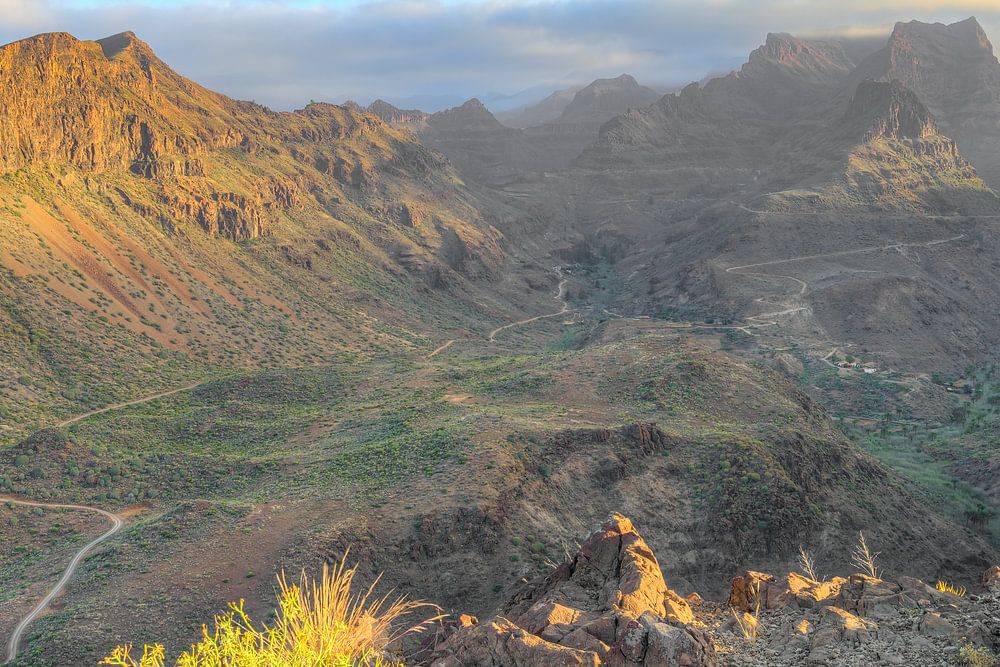 Ein atemberaubender Sonnenaufgang über Gran Canaria, eingefangen vom Mirador Astronómico de la Degollada de las Yeguas: Die ersten Strahlen durchbrechen den Morgennebel, tauchen die Berge in goldenes Licht und enthüllen die wilde Schönheit der Insel in stiller, magischer Klarheit.