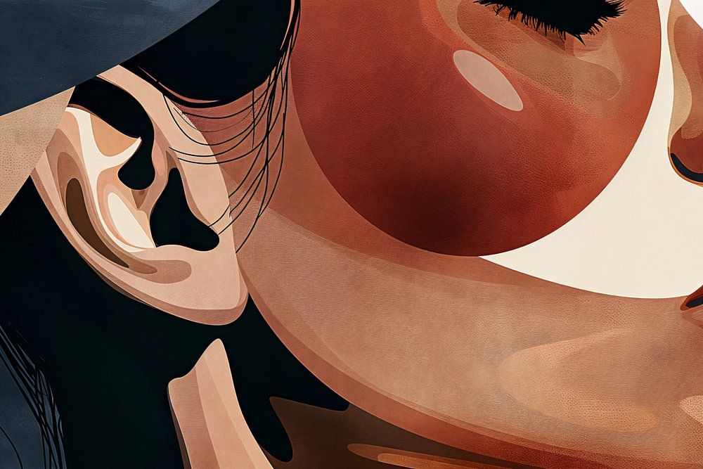 Ein stilisiertes Porträt einer Frau mit geschlossenen Augen im Profil, in warmen und erdigen Tönen mit starkem Kontrast. Die abstrakte Komposition unterstreicht die ausdrucksstarke und heitere Emotion, die im Porträt eingefangen ist.