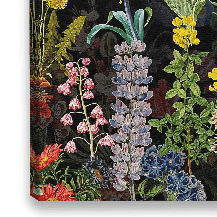 ANtique Blumen und frühblüher Wiese auf schwarzem Hintergrund.