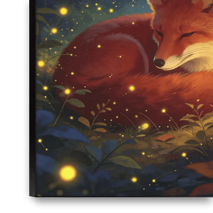 Ein zauberhafter Kunstdruck, der einen roten Fuchs in einem mondbeschienenen Herbstwald zeigt, umgeben von leuchtenden Glühwürmchen. Tiefes Blau, Waldgrün und warme Bernsteintöne schaffen eine traumhafte Waldatmosphäre. Perfekte vertikale Wanddekoration für Naturliebhaber und gemütliche, moderne Innenräume.