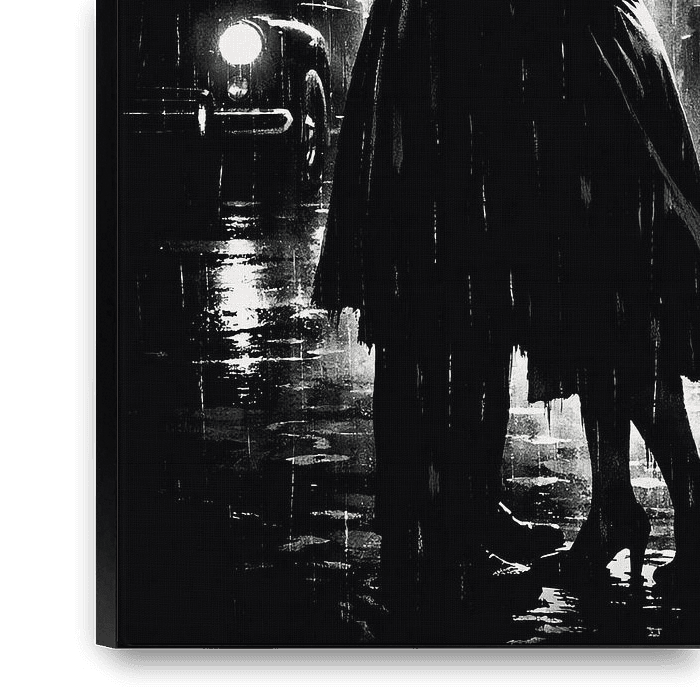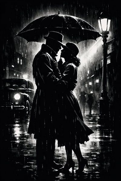 Dieses Kunstwerk fängt einen zeitlos romantischen Moment in einer regennassen Stadtstraße ein, der in dramatischen Schwarz-Weiß-Tönen wiedergegeben ist. Ein Paar steht eng beieinander unter einem Regenschirm, ihre Silhouetten werden von alten Straßenlaternen beleuchtet und die Reflexionen schimmern auf dem nassen Bürgersteig. Die…