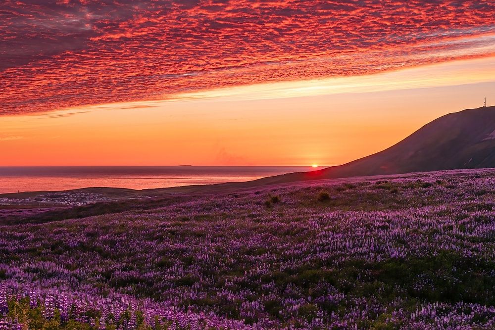 Die Lupinenblüte im Vordergrund kam in Island bisher nicht vor. Eigentlich ist nur eine Person für das Vorhandensein dieser Blume verantwortlich. 1945 wurde in Island ein Komitee gegründet, um Teile Islands wieder aufzuforsten. Hákon Bjarnason war derjenige, der die Blume in Alaska auswählte, und seitdem färben sich große Teile Islands in den Sommermonaten violett.