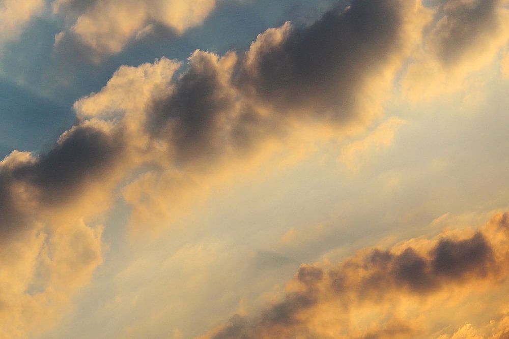 Zonsondergang in Limburg. De oranje zon steekt goed af tegen de blauwe lucht verderop en de ietwat donkere wolken.