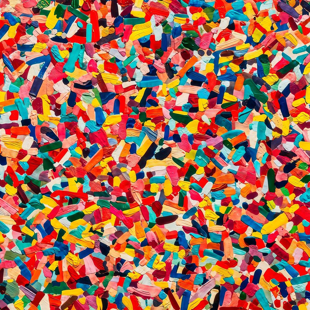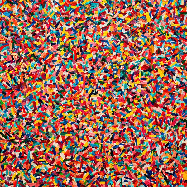 Ein äußerst detailreiches, lebendiges abstraktes Mosaik, zusammengesetzt aus unzähligen kleinen, unregelmäßig geformten, vielfarbigen Fragmenten, die dicht aneinander gereiht sind. Die Komposition zeichnet sich durch eine chaotische, aber harmonische Anordnung winziger, pinselstrichartiger Elemente in verschiedenen leuchtenden und…