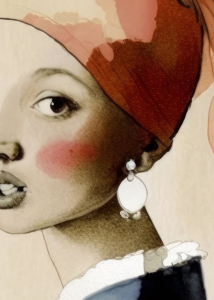 Modernes Mädchen mit der Perle, illustriert. Inspiriert von Johannes Vermeers Mädchen mit dem Perlenohrring, aber diesmal illustriert und im modernen Stil. Aquarell, hauptsächlich in Braun, Weiß, Blau und Rot. Sammlung neuer Meister, basierend auf den alten Meistern.
