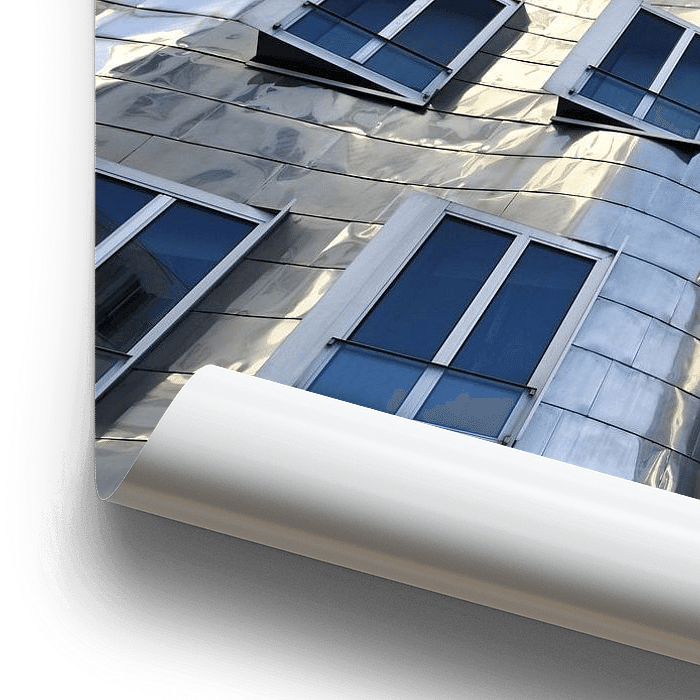 Das Bild zeigt ein Gebäude im Medienhafen von Düsseldorf. Die modern gestaltete Fassade aus Metall wirkt sehr fotogen.