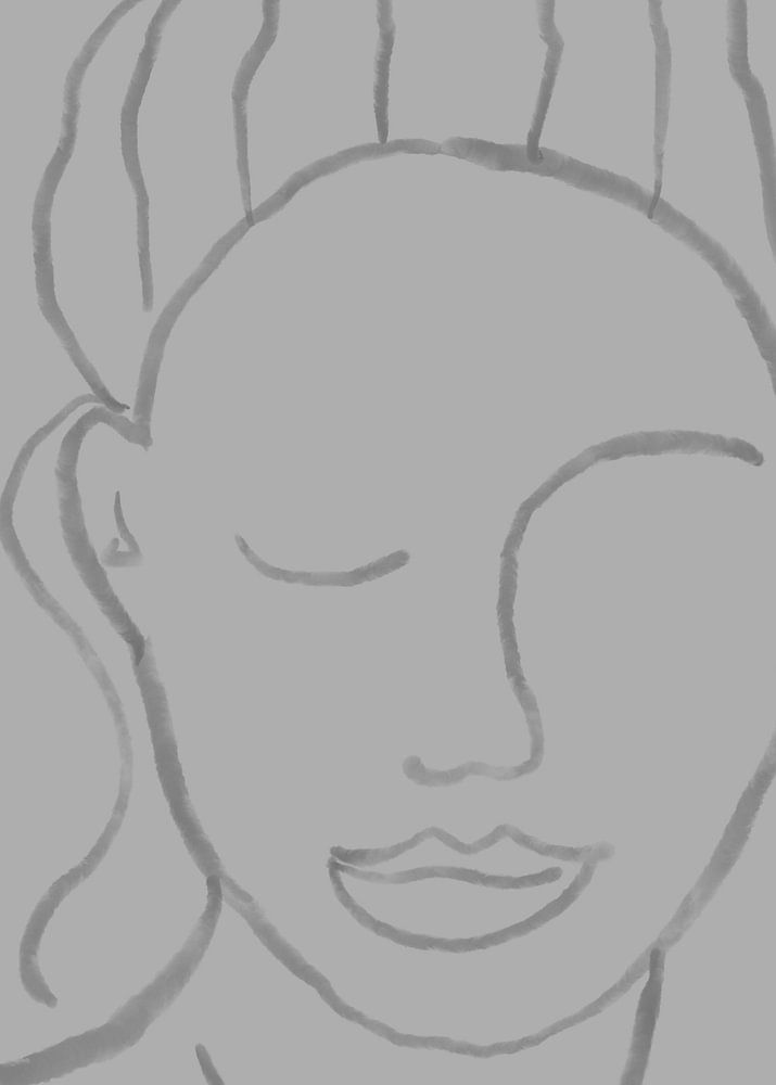 Moderner Abstrakt: Strichzeichnung Porträt in hellgrau und dunkelgrau. Minimalistisches Porträt eines Mädchens mit einem Dutt.