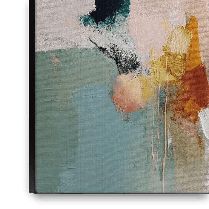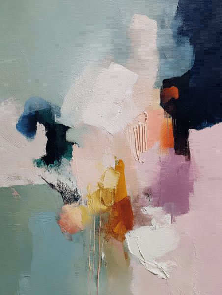 Eine subtile Kollision von Farbe und Gefühl. Sanfte Pastelltöne treffen auf tiefe Akzente in einem vielschichtigen Spiel aus Textur und Bewegung. Die Kombination aus transparenten Flächen, kraftvollen Pinselstrichen und leicht tropfender Farbe verleiht diesem Werk eine organische und fast poetische Dynamik.