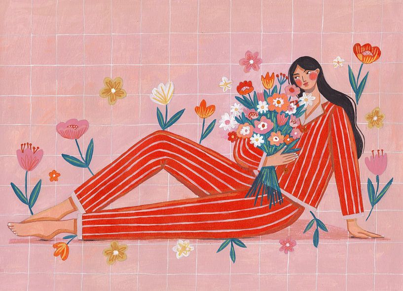 🌸 Blumenmoment ✨ Eine sanfte, verträumte Illustration einer Frau, die entspannt daliegt und einen bunten Blumenstrauß hält. Ihr rot gestreiftes Outfit bildet einen wunderschönen Kontrast zu den zarten Blumen, die um sie herum zu wachsen scheinen. Der warme rosa Hintergrund und die verspielten Details verleihen dem Bild eine moderne,…