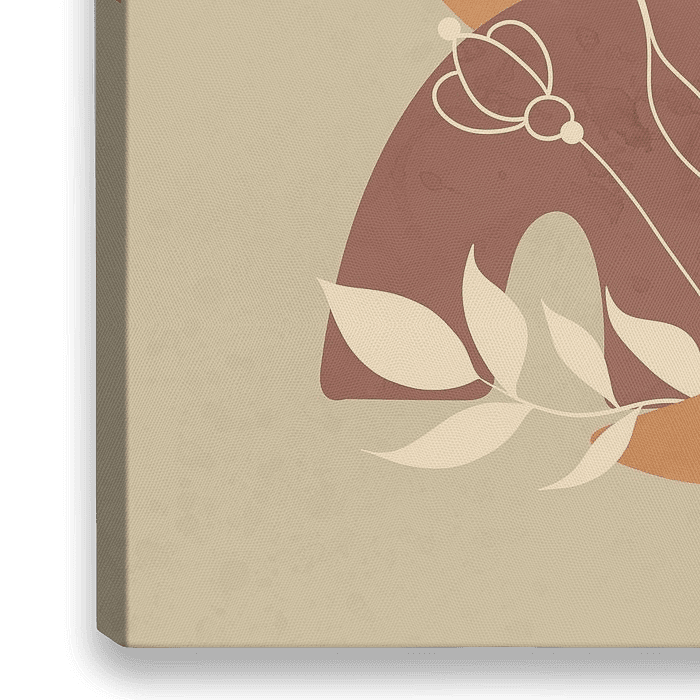 Moderne minimalistische Illustration einer Blume, eines Zweiges mit Blättern und verschiedenen organischen Formen in hellen Erdtönen, nämlich Terrakotta-Rot, Siena und Beige.