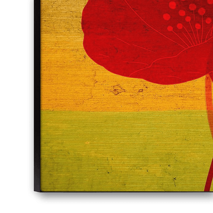 Dies ist ein modernes, minimalistisches Japandi-Kunstwerk mit zwei Mohnblumen (Poppies) in leuchtenden Farben.