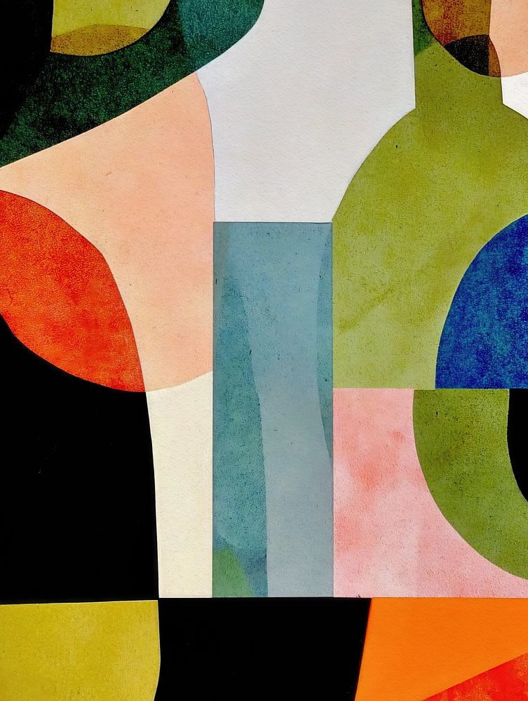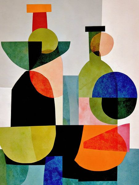 Eine lebendige abstrakte Komposition aus sich überlagernden geometrischen Formen und strukturierten Farbblöcken, die an Flaschen und Gegenstände erinnern, die auf einem Tisch angeordnet sind. Das Kunstwerk verbindet eine modernistische Struktur mit einer verspielten Farbharmonie und schafft durch Kreise, Rechtecke und Halbkreise eine…