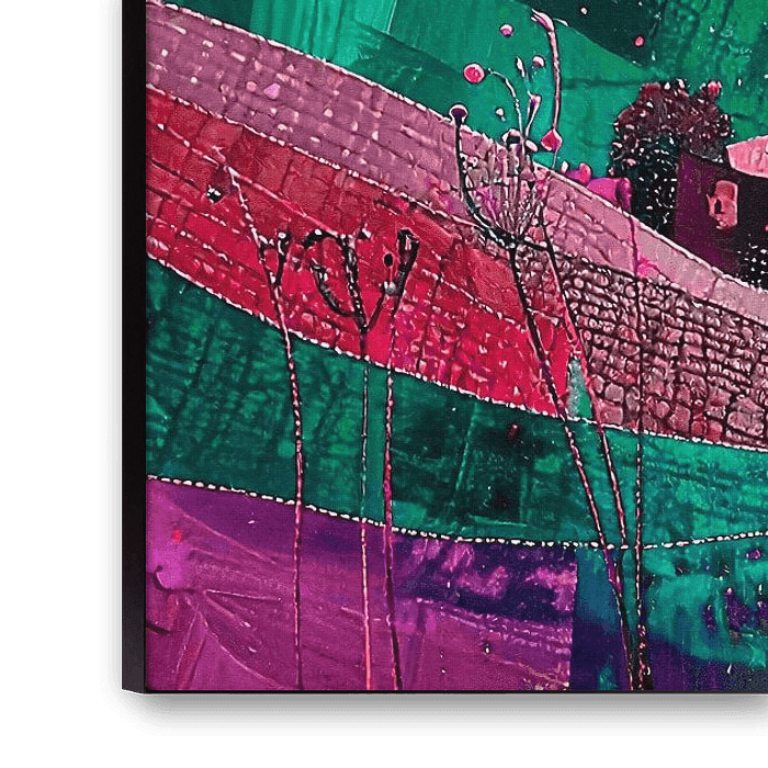 Eine farbenfrohe, abstrakte Berglandschaft mit mehrfarbiger Leinenstruktur und ungewöhnlichen Guilloche-Mustern.