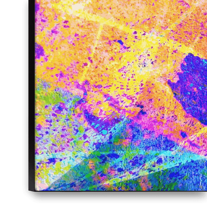 Bestelle dieses abstrakte Wandbild Moderne, abstrakte digitale Kunstwerke in Orange, Blau, Pink, Violett von Art By Dominic als Reproduktion auf Leinwand, Alu-Dibond, als Poster, Fototapete oder Acrylglasbild.