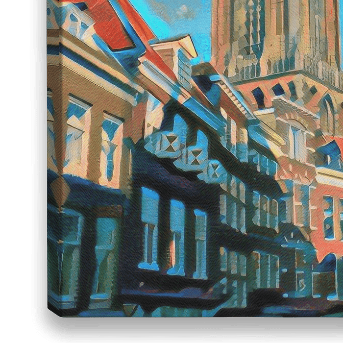 Wir machen Kunst mit künstlicher Intelligenz. Unser Algorithmus beherrscht verschiedene Malstile. Zum Beispiel expressionistisch oder vom Kubismus inspiriert! Wir malen bekannte Orte der großen niederländischen Städte mit unserem Algorithmus. Die Groningen Hoge der Aa im Stil von Van Gogh. Die Rotterdamer Erasmusbrücke im Stil von Picasso. Oder die Grachtenhäuser, als ob Piet Mondrian bei der Arbeit gewesen wäre!