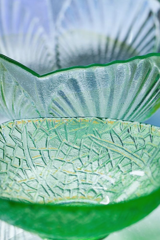 Close-up der modernen Design-grüner Glasschalen mit einem feinen Muster auf einem Glasregal angezeigt
