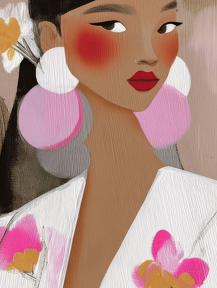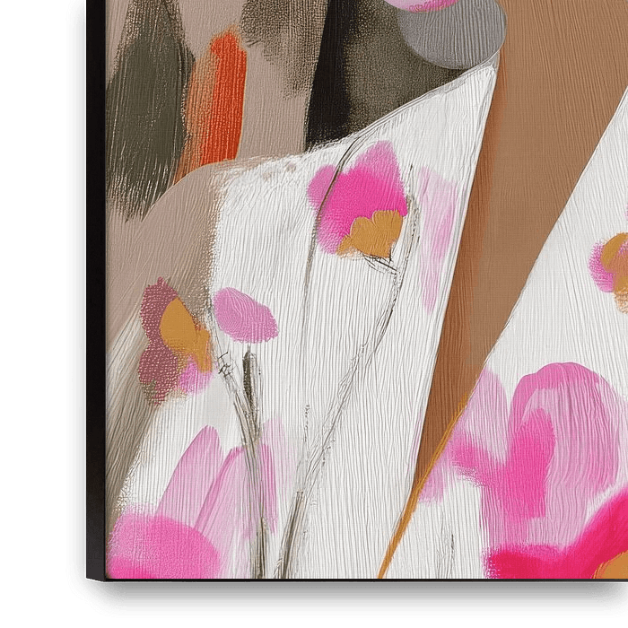 Dieses moderne Frauenporträt vereint Eleganz und Verspieltheit in einer stilvollen, zeitgenössischen Komposition. Die sanften Erdtöne bilden eine ruhige Grundlage, während das lebhafte Rosa und die warmen Akzente in den Blumen und Accessoires für eine frische und feminine Ausstrahlung sorgen.