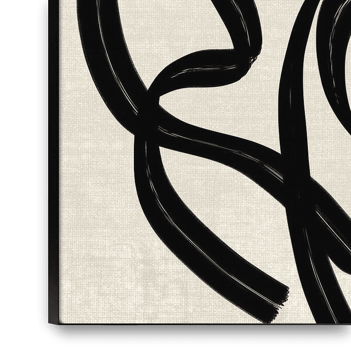 Ein abstraktes Kunstwerk mit groben, geschwungenen Pinselstrichen in schwarzer Farbe und beigem Hintergrund, mit Texturen im Boho-Stil.