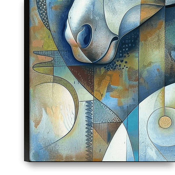 Ein Pferd im abstrakten, kubistischen Stil mit geometrischen Formen und verschiedenen Farbtönen. Das Bild verbindet realistische Elemente mit lebendigem, modernem künstlerischem Ausdruck.