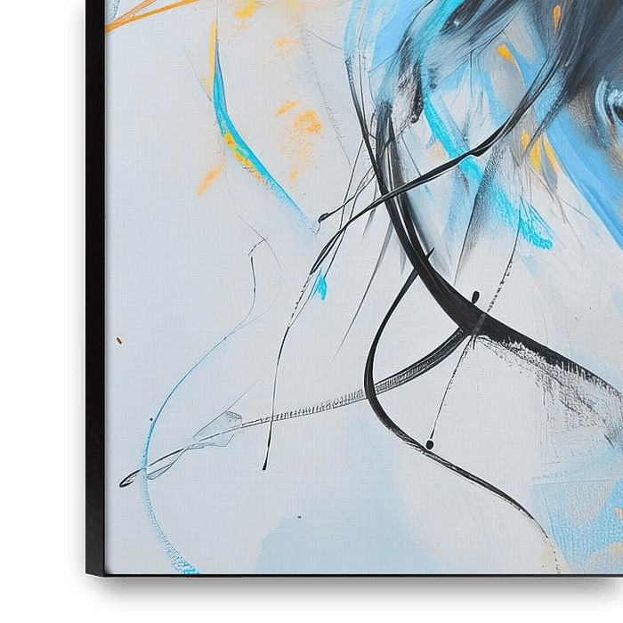 Modernes Porträt | Bewegung - Bei diesem dynamischen Porträt fallen die lebhaften Kontraste zwischen Orange, Blau und Gelb sofort ins Auge. Die wirbelnden, fast abstrakten Striche erzeugen ein Gefühl der Bewegung, während die scheinbar zufälligen schwarzen Linien die Intensität und Tiefe des Werks noch verstärken.
