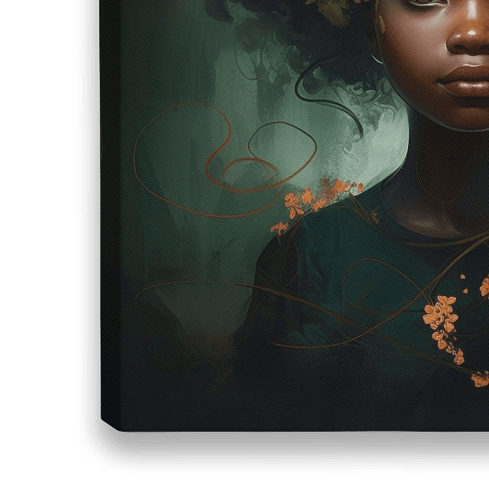Modernes Porträt eines jungen Mädchens in verschiedenen (tiefen) Grüntönen kombiniert mit leuchtenden Orangetönen mit dem Titel "Botanical Brilliance". Das Mädchen ist von botanischen Elementen umgeben, die sie noch mehr mit der Natur verschmelzen lassen. Ein besonderes und einzigartiges Porträt für Ihre Wand!
