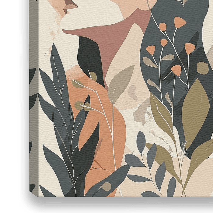 Modern Portrait | Silent Profiles - Dieses stilvolle Kunstwerk verbindet Natur und Porträt zu einem harmonischen Ganzen, wobei stilisierte Blattformen anmutig über die Figuren fallen. Die gedämpfte Farbpalette mit Erdtönen und Akzenten in Terrakotta und tiefem Grün verleiht dem Bild ein ruhiges Aussehen, das perfekt in ein…