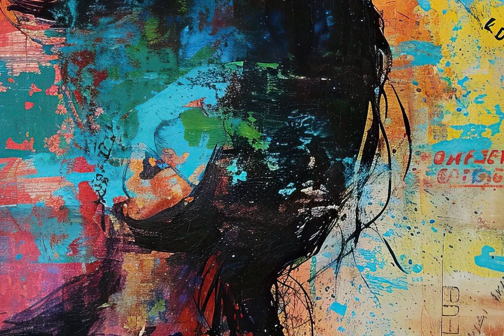Modern Portrait | Urban - Dieses Kunstwerk mit seiner dynamischen Abstraktion zeigt das Seitenprofil einer Person, die eine Sonnenbrille trägt, in kontrastierenden Farbbereichen, die ein ausdrucksstarkes Gefühl erzeugen. Die Kombination aus handschriftlichen Fragmenten und reicher Textur verleiht dem Werk einen urbanen Touch, während die Primärfarben Blau, Gelb und Rot das Werk beleben.