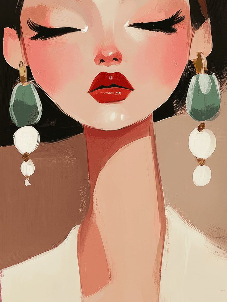 Dieses elegante Porträt zeigt eine Frau mit geschlossenen Augen, heiterem Blick und zuversichtlicher Ruhe. Ihr breitkrempiger Hut, weiche Hauttöne und ausgeprägter Schmuck verleihen dem Werk eine modische, fast zeitlose Ausstrahlung. Die Farben bewegen sich zwischen warmem Terrakotta, Puderrosa, Creme und tiefen Akzenten, wodurch das…
