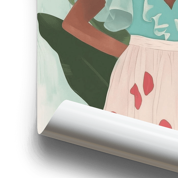Modernes Porträt in Pastellfarben, Illustration. Eine junge Frau steht vor großen Blättern, dieses Werk hat einen tropischen Touch. Ein besonderer Blickfang!