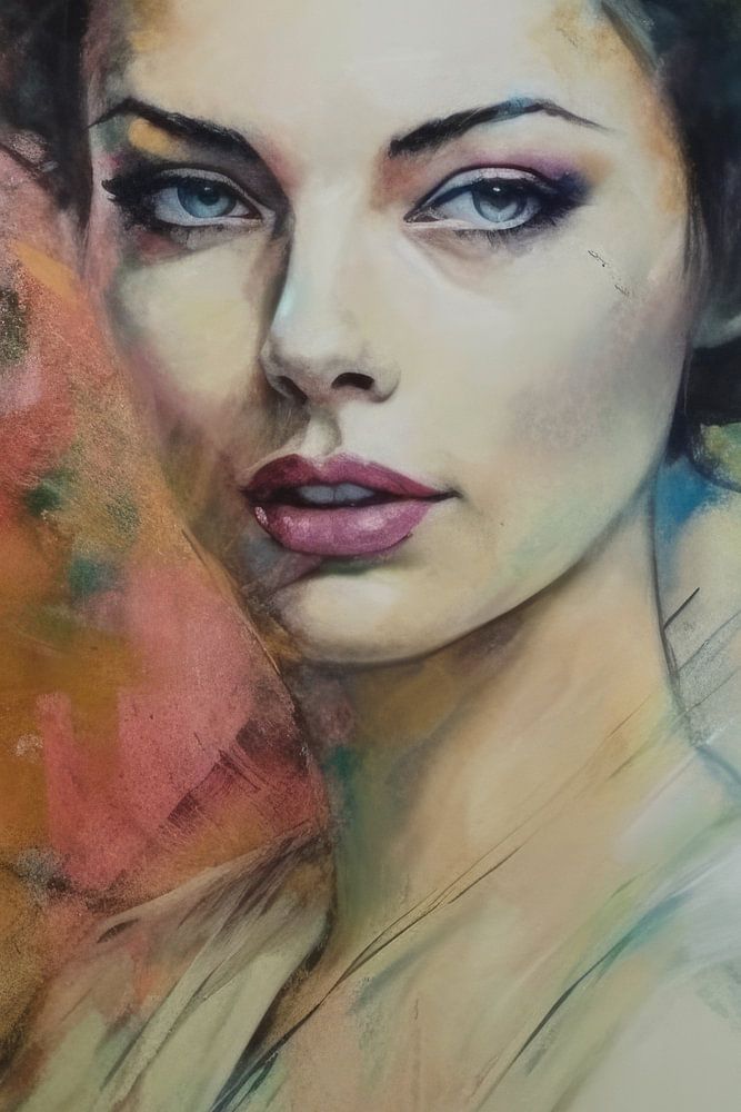 Modernes Porträt einer jungen Frau in warmen und hellen Farben. Hauptsächlich blaue, gelbe und rosa Töne. Starke Kontraste, durchsetzt mit helleren Tönen, sorgen dafür, dass sich dieses Werk von Ihrer Wand abhebt!