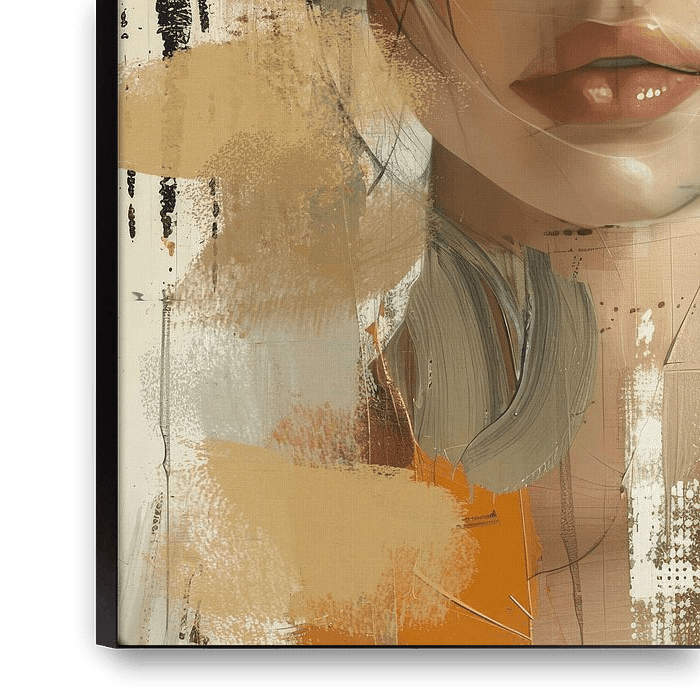 Modernes abstraktes Porträt in Orange, Gold und Taupe. Wählen Sie die Größe und das Material für diese Arbeit und machen es zu Ihrem Interieur passen.