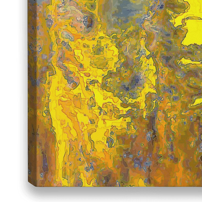 Bestelle dieses abstrakte Wandbild Modernes, abstraktes digitales Kunstwerk in Gelb Orange Blau von Art By Dominic als Reproduktion auf Leinwand, Alu-Dibond, als Poster, Fototapete oder Acrylglasbild.