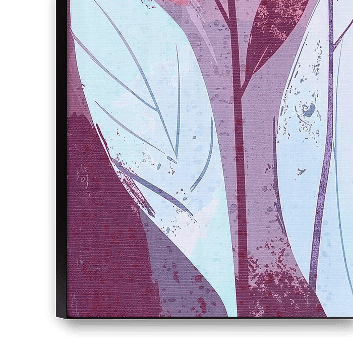 Die Farbpalette besteht aus Violett-, Flieder- und Mauvetönen, ergänzt durch Weiß und einen Hauch von Burgunderrot. Große, stilisierte Blätter stehen im Kontrast zu den zarten, dunkleren Dolden.