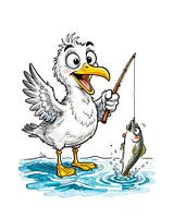 Darstellung einer Möwe, die im seichten Küstenwasser steht und eine Angelrute mit einem gefangenen Fisch hält. Küstenkulisse mit ausdrucksstarken Figuren.