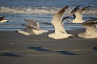 Wir verbrachten einige Zeit am Strand in der Nähe von St. Augustine in Florida, USA. Wir liebten die frühe Abendsonne auf diesem vorbeiziehenden Möwenschwarm.