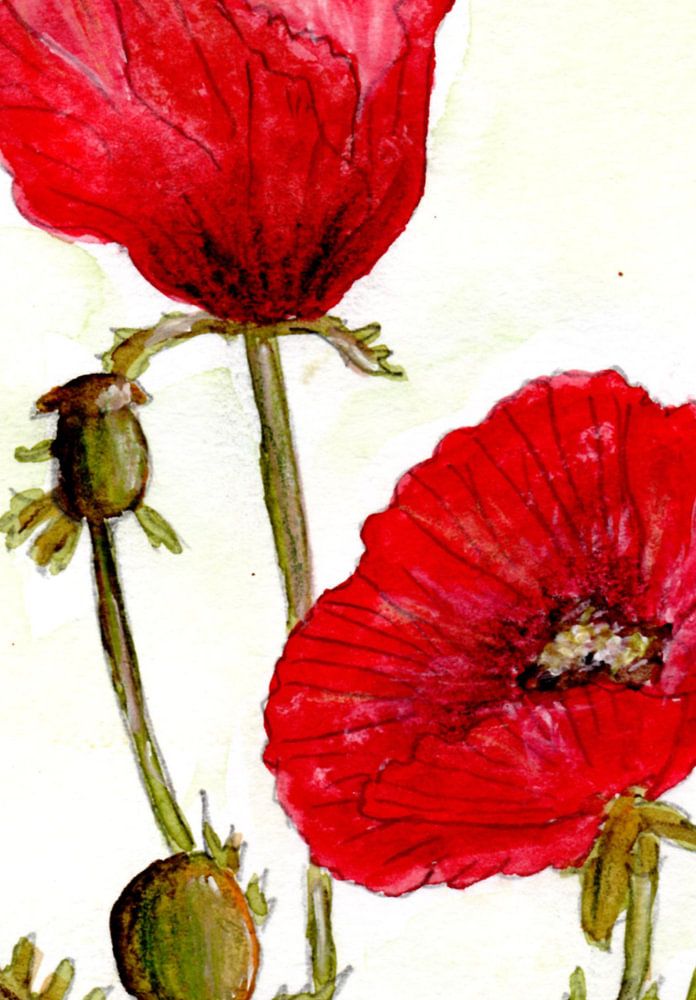 Das Motiv dieses Aquarells ist der Mohn mit seinen Blüten im kraftvollen Rot.