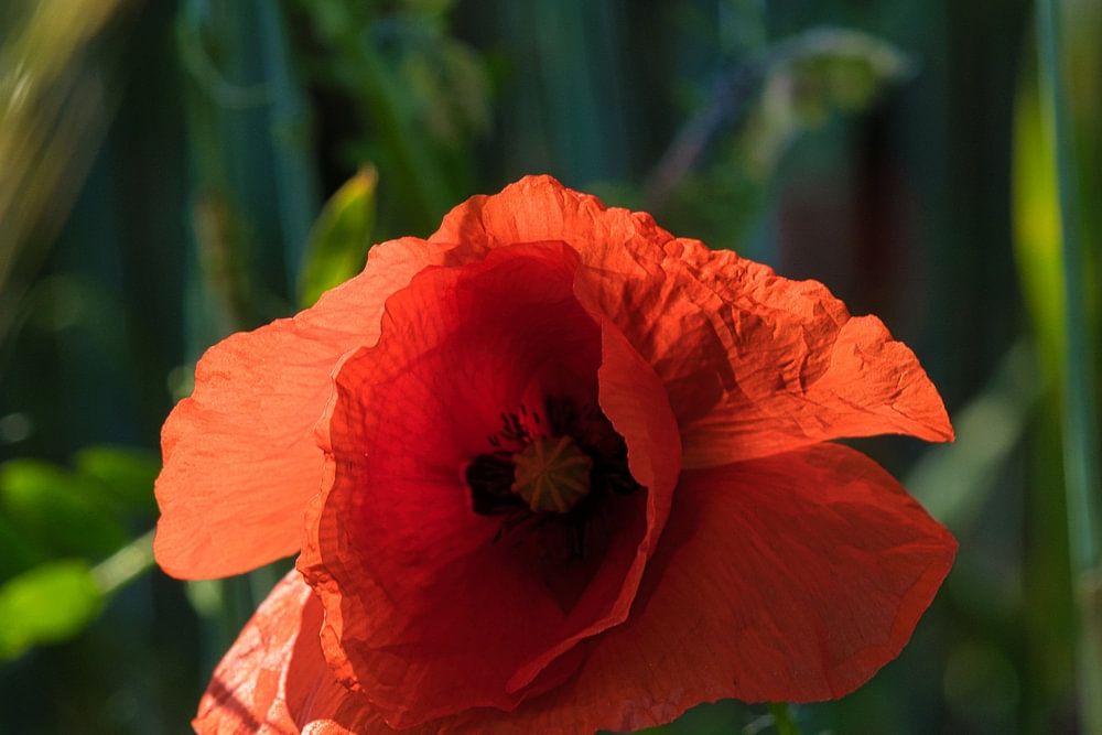Mohnblume mit roten Blütenblättern. Mohnblumen Feld. Rote Blüten mit grünen Blättern. Frühsommer Blumen.