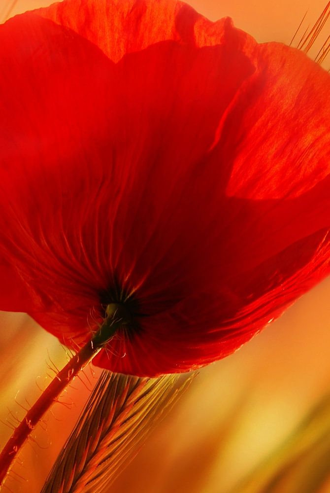 Rote Mohnblume bei Sonnenuntergang, Makroaufnahme
